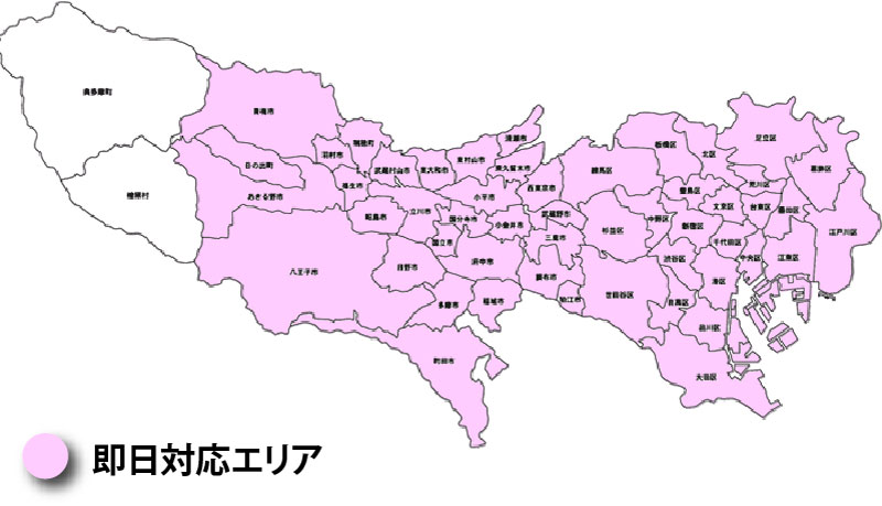 23区・立川市・多摩市・日野市・府中市・町田市・狛江市・調布市・清瀬市・東久留米市・東村山市・三鷹市・西東京市・武蔵野市・小金井市・国立市・稲城市・国分寺市・八王子市・昭島市・小平市・福生市・武蔵村山市・東大和市・西多摩郡日の出町・あきる野市・西多摩郡瑞穂町・羽村市・青梅市