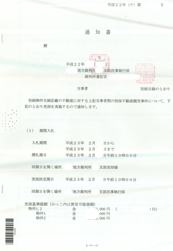 6.売却基準価格と買受可能価格が設定され期間入札の通知書が届きます。これで何時の